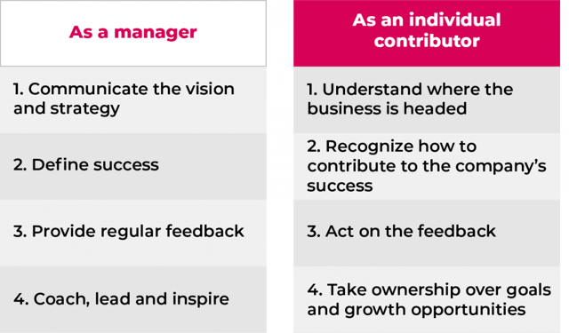 In reality, it’s much more complex. Think of performance management as an ongoing process, where both parties have responsibilities: